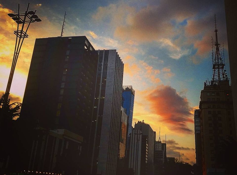 A Paulista entre as nuvens… Ao inaugurar os tempos outonais, as tardes caem como folhas das árvores que desmaiam suas verduras para revigorar suas energias. No entanto, a avenida no alto da cidade nunca perde o seu vigor – tardes, noites e manhãs…