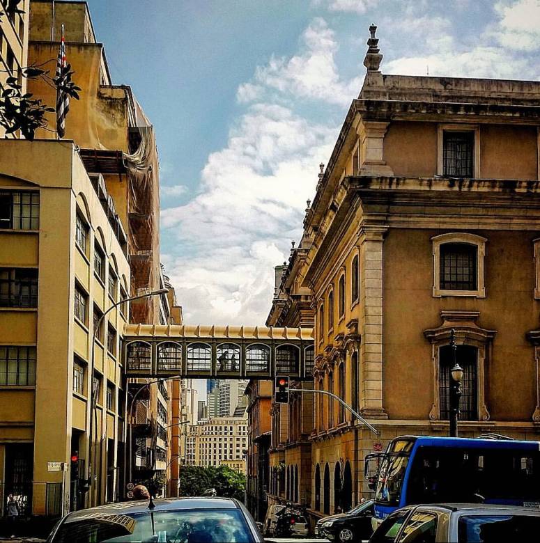 Passarela sobre a Rua Riachuelo, que une dois prédios da Faculdade de Direito da Universidade de São Paulo — Largo de São Francisco.