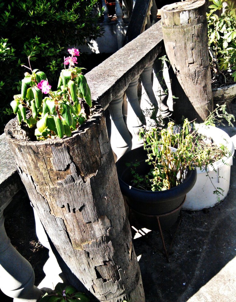 Tínhamos um belo coqueiro no quintal, visitado por abelhas, maritacas e outros pássaros que, além de nós, se deliciavam com os seus coquinhos amarelinhos, quando maduros Seus cachos viviam carregados, até que um dia… uma senhora, a nos visitar, lançou um olhar indeterminado e exclamou: “Que lindo!”. Na semana seguinte, de forma avassaladora, ele começou a definhar e secou. Tivemos que cortá-lo, já que ficou irrecuperável! Abaixo, podemos ver dois pedaços cortados, que conservamos como lembrança de sua bela existência.