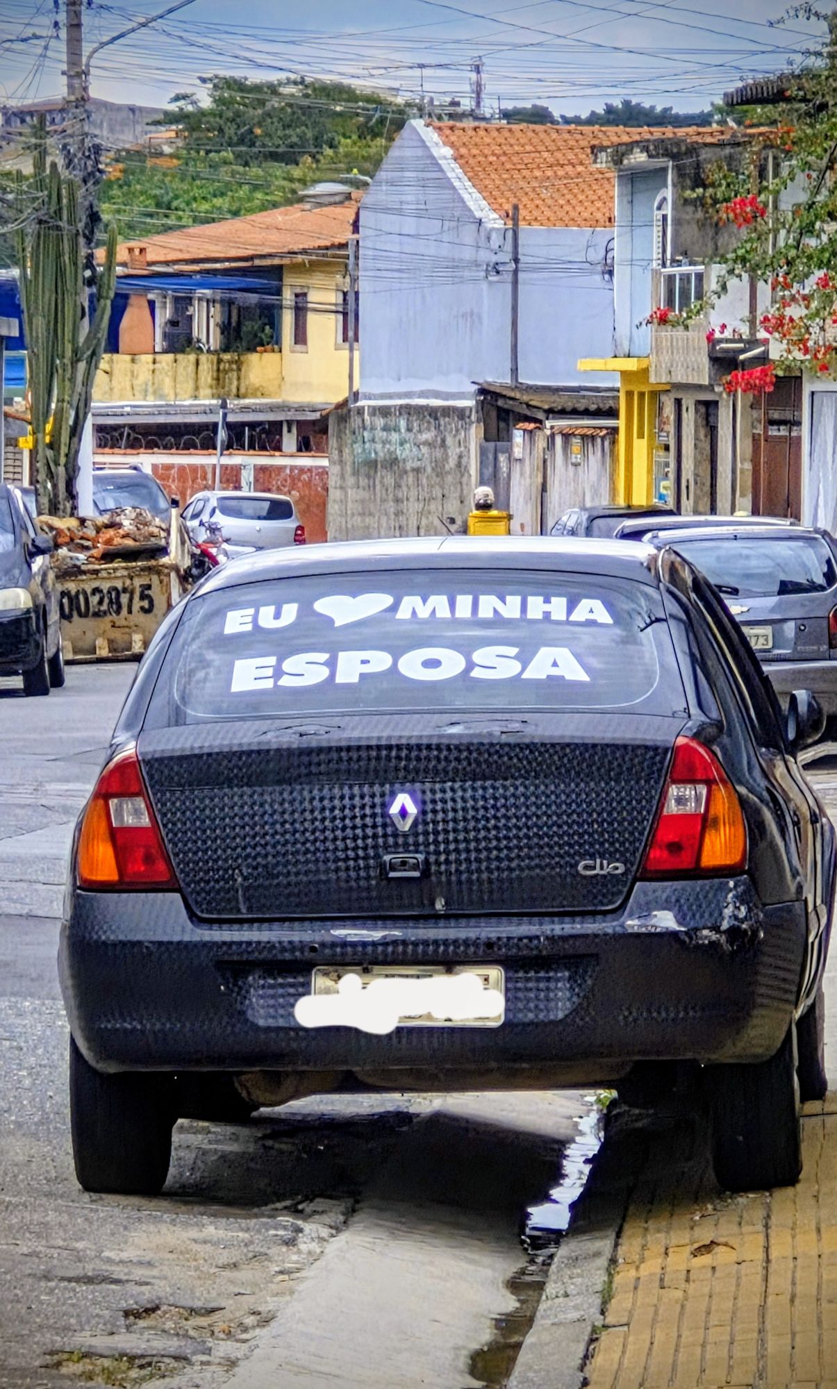 Esta foto eu fiz há uma semana. Declaração tão ostensiva de amor ainda mais por uma esposa nunca vi. Fiz algumas considerações mentais acerca da frase. Não duvido que ela possa excitar a imaginação de muitas mulheres que talvez queiram saber quem seja tal sujeito, enquanto incomode muitos maridos mais contidos em entoar mensagens mais explícitas. Registro feita na minha rua.