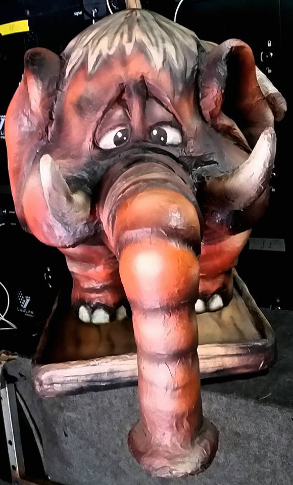 Encontrei este elefantinho atrás do palco, no local onde estava trabalhando. Perguntei como ele estava. Respondeu que estava bem. Que, apesar de se sentir meio abandonado naquele canto, pelo menos estava de frente para a porta, onde podia ver o movimento.