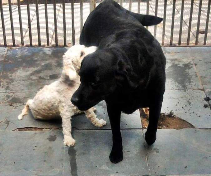 A minha irmã, Marisol — em busca da nossa poodle Sandy que sumira — em suas andanças pelas ruas do bairro, acabou por recolher dois outros cães. Passado um ano da passagem da minha mãe, cuidadora de bichos durante toda a sua vida, ela começou a desenvolver um comportamento similar e nunca deixou de procurar a companheira constante de Dona Madalena. A Sandy esperava o dia inteiro no portão a volta da minha mãe de sua última internação (o que nunca ocorreu) e, um dia, desapareceu ser deixar vestígios. Vizinha separada por um portão, para não misturarmos os cachorros do lado dela (são cinco) com as cadelas do meu lado (quatro), os encontrou no dia de São Bento. Católica fervorosa, a Marisol nomeou a um deles em homenagem do santo. Bento, provavelmente abandonado por causa de uma paralisia dos membros posteriores, só consegue andar por algum tempo com o uso constante de remédios. Boa parte do dia, ele mal consegue se deslocar. Mas isso não o impediu que transpusesse o portão e tentasse encontrar a Penélope — labradora grande e acima do peso — no cio. Este chamado da natureza foi poderoso o suficiente para propiciar o registro dessa paixão.