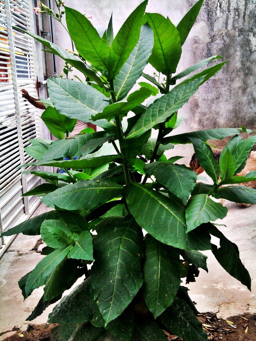Nicotiana tabacum — esse é o nome da planta. Um espécime dela rompeu o solo de uma área ainda não acabada da nossa casa. Quando todo o terreno ainda estava livre de construções, costumava brotar vários exemplares dessas plantas de fumo entre as folhas de abóboras e caules de cana-de-açúcar.