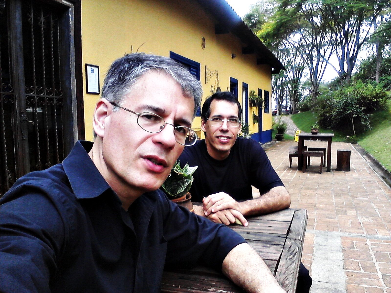 Neste registro de 2011, estamos, meu irmão, Humberto e eu, em momento de descanso depois da montagem do equipamento da Ortega Luz & Som para a realização de mais um trabalho de sonorização. O local em que estávamos, foi uma antiga fazenda de café transformada em local de eventos. Na sede do Hotel Fazenda, encontramos várias referências à época da escravidão, incluindo as senzalas nos casarões. Patrimônio construído com sangue e suor dos escravizados que agora é usado para diversão de quem pode pagar.