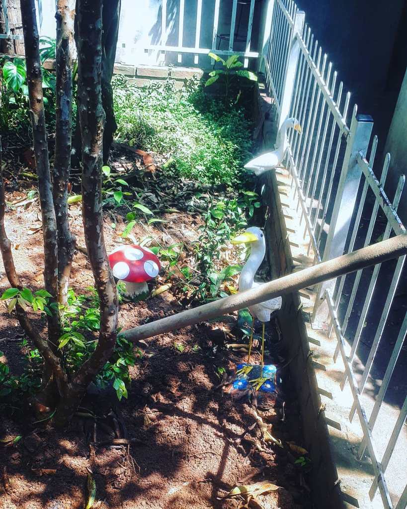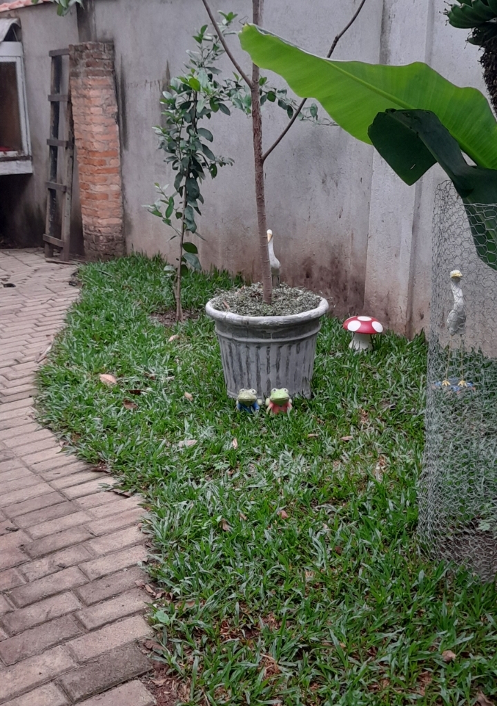 Porém, a Tânia voltou a encontrá-lo ao começar a fazer uma horta. Logo que pode, reassumiu o lugar ao lado de seu amigo que estava, desde o seu sumiço, triste e só. Não mais estarão juntos a hortaliças, pimenteiras, alho, hortelã, cebolinha… Deslocados para o jardim da frente — Yellow Brick Road Garden — ficarão estacionados no gramado no qual poderão “viver” camuflados e seguros…