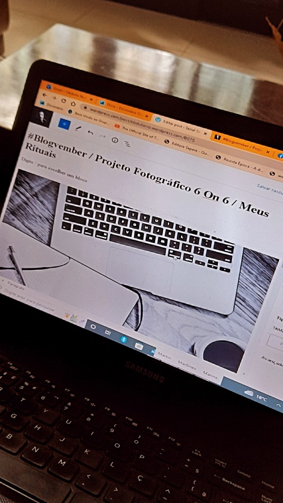 Fiquei, quanto à proposição do tema, tentando encontrar algo que se assemelhasse a uma rotina que pudesse ser chamada de ritual – um cronograma pessoal regular-repetitivo. De fato, há atividades que estabeleço como prioridades, como escrever. Porém, tenho que buscar tempo entre tarefas e atribuições de quem trabalha por conta para me postar de frente para o computador e fazer jorrar minhas ideias transformadas em palavras. Para me sentir estimulado, aceito tarefas sugeridas por Lunna Guedes, editora da Scenarium, como este 6 On 6, inserido na maratona intitulada #Blogvember, que estabelece postagens diárias estimuladas por temas dados.