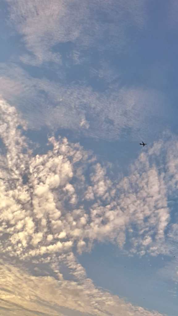 Mentalmente, estava a brincar com os dados visuais que se apresentavam ao meu redor: asfalto, prédios, árvores, céu, carros, cores, vento, nuvens… e o Sol nascente… De carona no veículo, como sempre (pois não dirijo), sentia os objetos a me atravessarem enquanto passava por eles. Antes de uma faixa de segurança, parado no sinal vermelho, um avião cruzou o meu olhar, quilômetros acima, em voo para algum lugar… Escrevi no meu caderninho mental: “Vovô viu o avião a voar…”. Era apenas um jogo de palavras, uma aliteração em “V”, como muitas que fazia, na maioria das vezes sem sentido, mas que me divertia.
