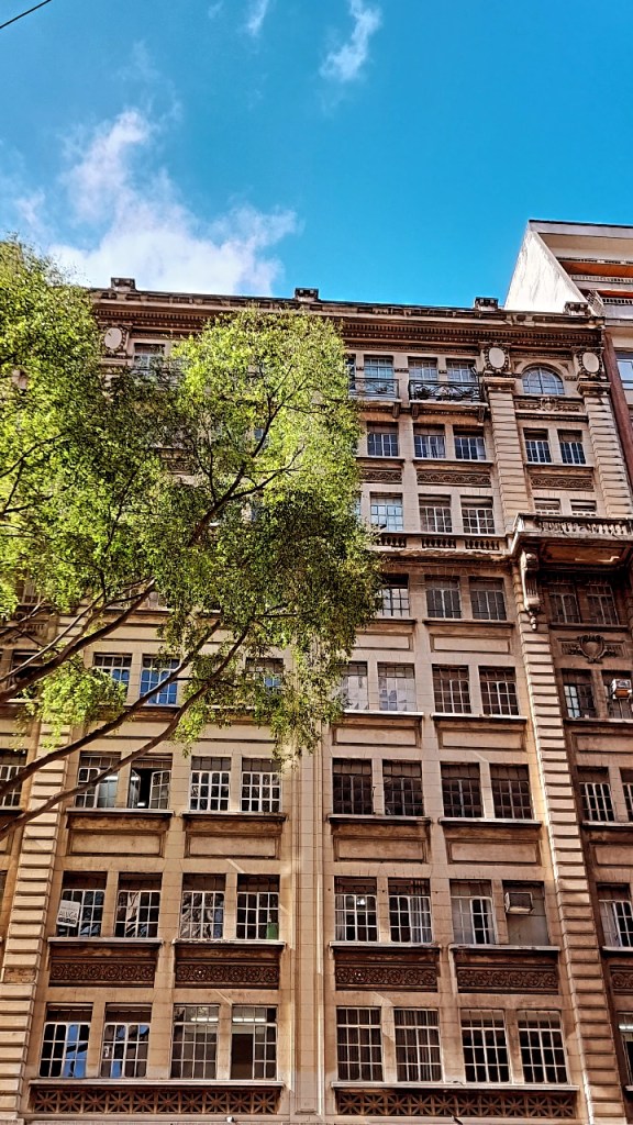 Caminhando pelos calçadões do Centrão, costumo me perder em olhares por seus descaminhos confusionais de Tempo e Espaço. Assim como citei acima sobre a Santa Ephigênia, apesar de gostar de me sentir desconfortável por não estar onde estou, vez ou outra me sinto surpreendido por observar essas construções tão velhas quanto eu com um olhar novo. Neste caso, talvez seja pela fluídica árvore nova, a destoar do ambiente concreto. Depois de observar melhor, o edifício ao lado parece ter uma forma alternativa que só poderei confirmar ao voltar a vê-lo. Quanto ao prédio protagonista, é ele que sinto me observar por seus muitíssimos olhos. (Vista desde a vazia Rua Marconi, em 2021).