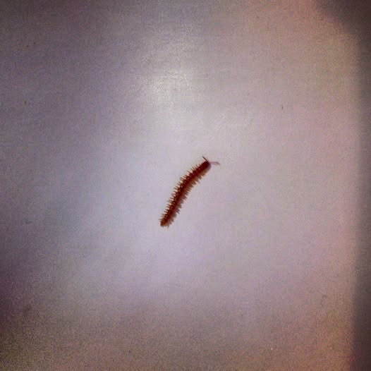 Está pequena centopeia caiu na cuba da pia do banheiro de fora e não conseguia vencer a sua curvatura. É muito frustrante escorregar com dois pés, imaginem com algumas dezenas. Ajudei o bichinho a superar o trajeto com um graveto e ganhei a minha tarde…