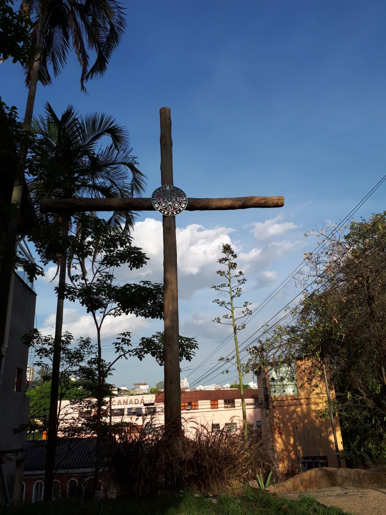 Esta cruz fica na região de Guarulhos, cidade ao lado da região norte de São Paulo. A paleta que apresenta é simbólica. Fica em frente a uma igreja, do lado de um teatro onde trabalhei em alguns eventos. Fiquei bem impressionado não apenas pelo Teatro Padre Bento, mas pelo antigo estádio e as instalações do antigo hospital construído para tratar os hansenianos. O teatro foi construído pelos próprios internos e inaugurado em 1936, no bairro Gopoúva. Já o Hospital Padre Bento, de 1931, foi um sanatório referência no tratamento da hanseníase (conhecida na época como lepra). O modo escolhido para tratar os hansenianos foi a internação compulsória, oficializada por meio de medida decretada em 1933 por Getúlio Vargas. Os pacientes eram obrigados a ficar em lugares como o Padre Bento, construídos especialmente para abrigá-los. Passaram a serem liberados de locais como esse a partir da década de 1960. A simples adoção de um medicamento, a Poliquimioterapia (PQT) passou a curar a hanseníase, interrompendo a transmissão e prevenindo deformidades. Atualmente, está disponível gratuitamente em todos os postos, centros de saúde e unidades de saúde da família.