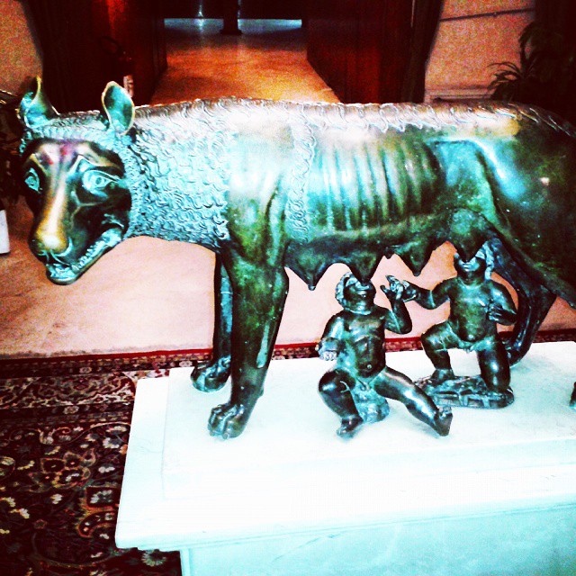 Na antessala do salão de festas, junto a uma bela biblioteca e de estantes de vidro com várias outras peças, sobre uma mesa, temos a Lupa Capitolina, a loba que alimentou os irmãos gêmeos, Rômulo e Remo, fundadores de Roma, após terem sido abandonados por Reia Sílvia, filha de Enéias. Segundo a lenda, eles foram gerados após um estupro sofrido por ela perpetrado pelo deus da guerra, Marte. Foram criados por um pastor e viveram de saques e assaltos até Remo matar Rômulo em uma disputa para saber onde construiriam a cidade que seria sede de um poder que mudou a face do mundo, pela violência e pela lei.